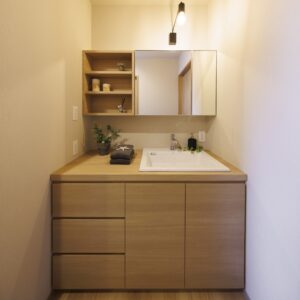 引き出しや鏡裏収納を活用し、化粧品やタオルをスッキリ整理整頓。デッドスペースを活かした設計で、限られたスペースでも驚きの収納力を実現します。