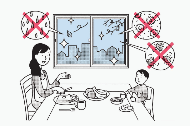 空気が出入りするすき間が少なくなるので、 外から入る音を低減し、同時に室内音が近隣に漏れるのも抑えることができます。